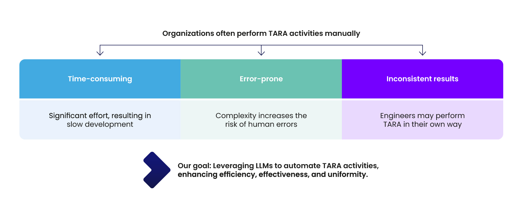 Typically, TARA activities are performed manually by cybersecurity engineers – a time-consuming task that may result in incomplete or incorrect results. Furthermore, the task of performing TARA depends on the individual viewpoint of the respective cybersecurity engineer, which is to a certain degree subjective. As a result, TARAs performed by different engineers may vary significantly (Figure 1) potentially resulting in inconsistent results.