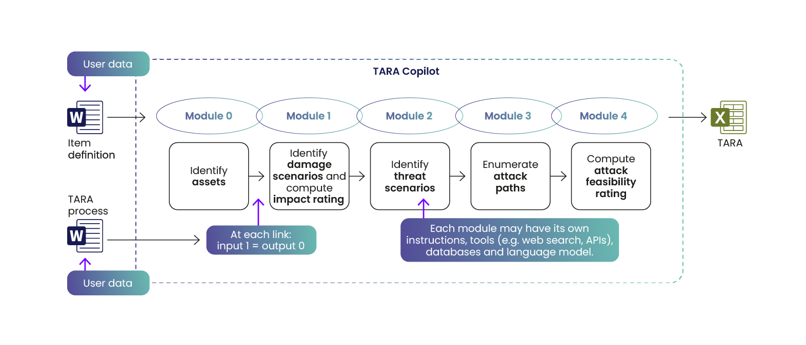 Each TARA activity is encapsulated as an independent module within the chain, forming the backbone of the system’s modular architecture. Every module leverages LLMs to generate specific TARA outputs based on defined inputs – such as the item definition, tailored instructions (i.e., prompts) and, when required, external databases. The output of each module seamlessly feeds into the subsequent one; for example, the results from the asset identification are directly utilized in the damage scenario identification module.