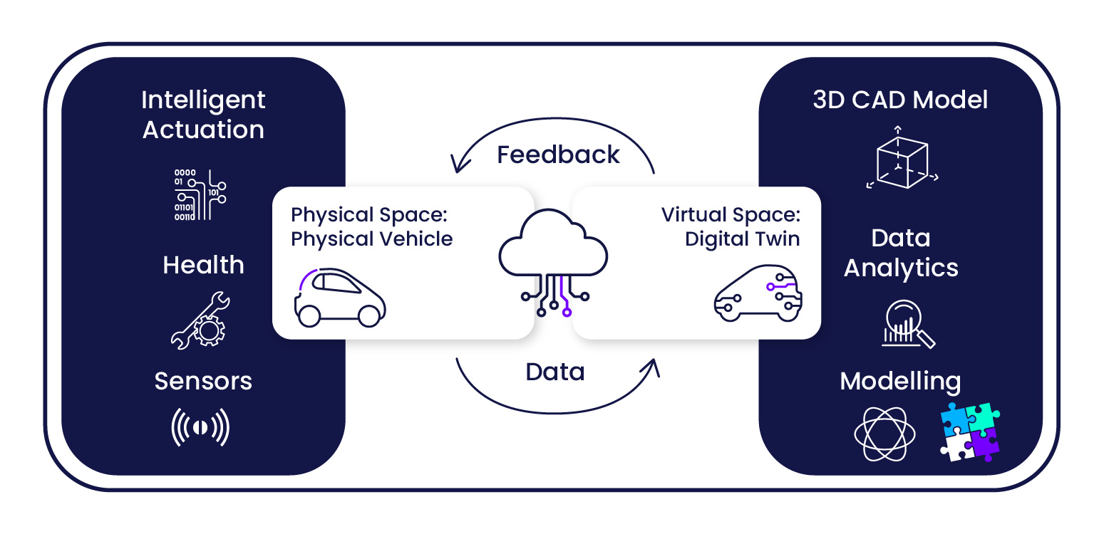 A Digital Twin is a data-driven virtual representation of a physical system, built from real-time and historical data (data analytics expertise) and enriched with domain knowledge (engineering expertise). For example, a vehicle equipped with sensors and actuators generates data that feeds into its Digital Twin.